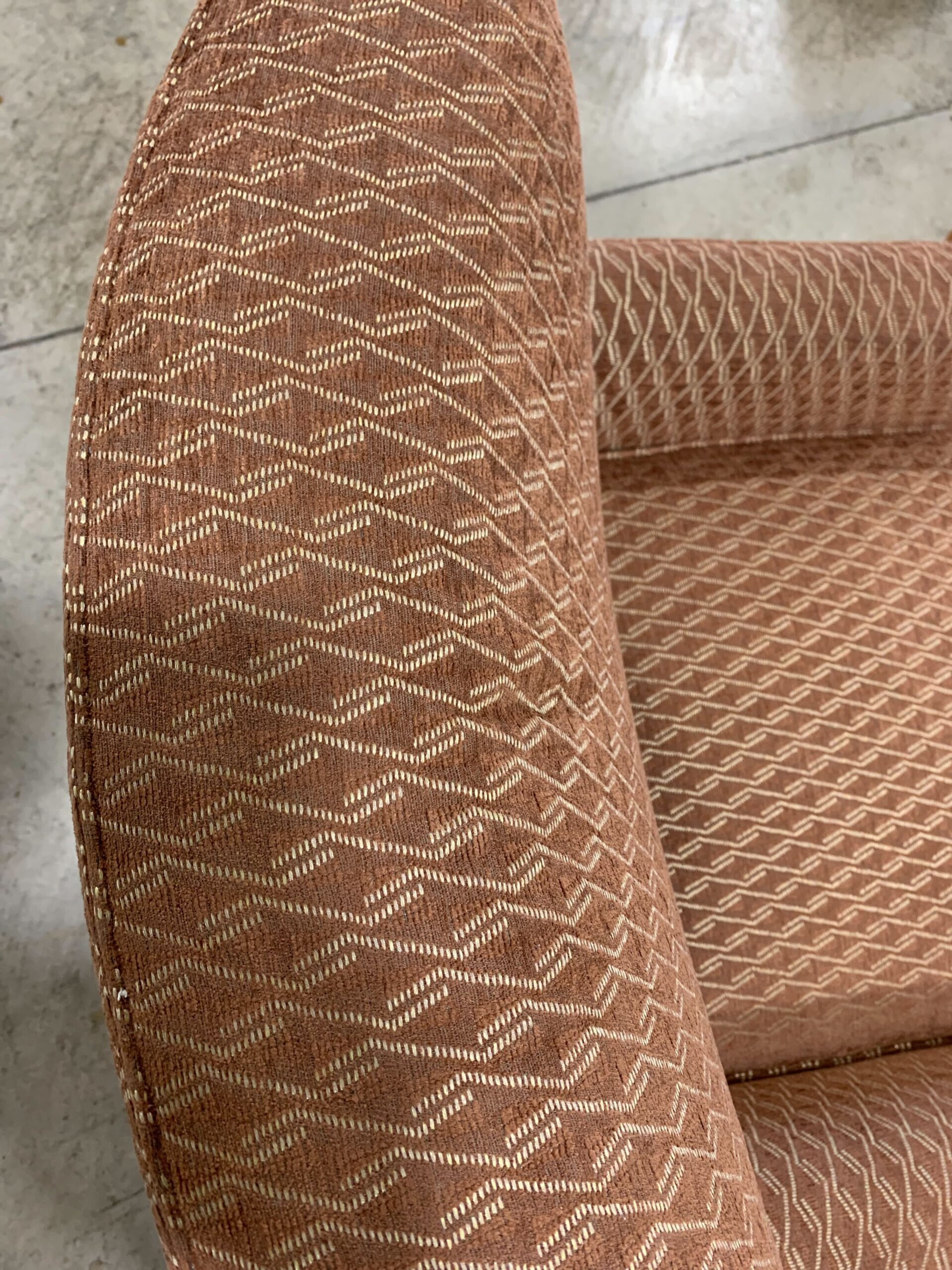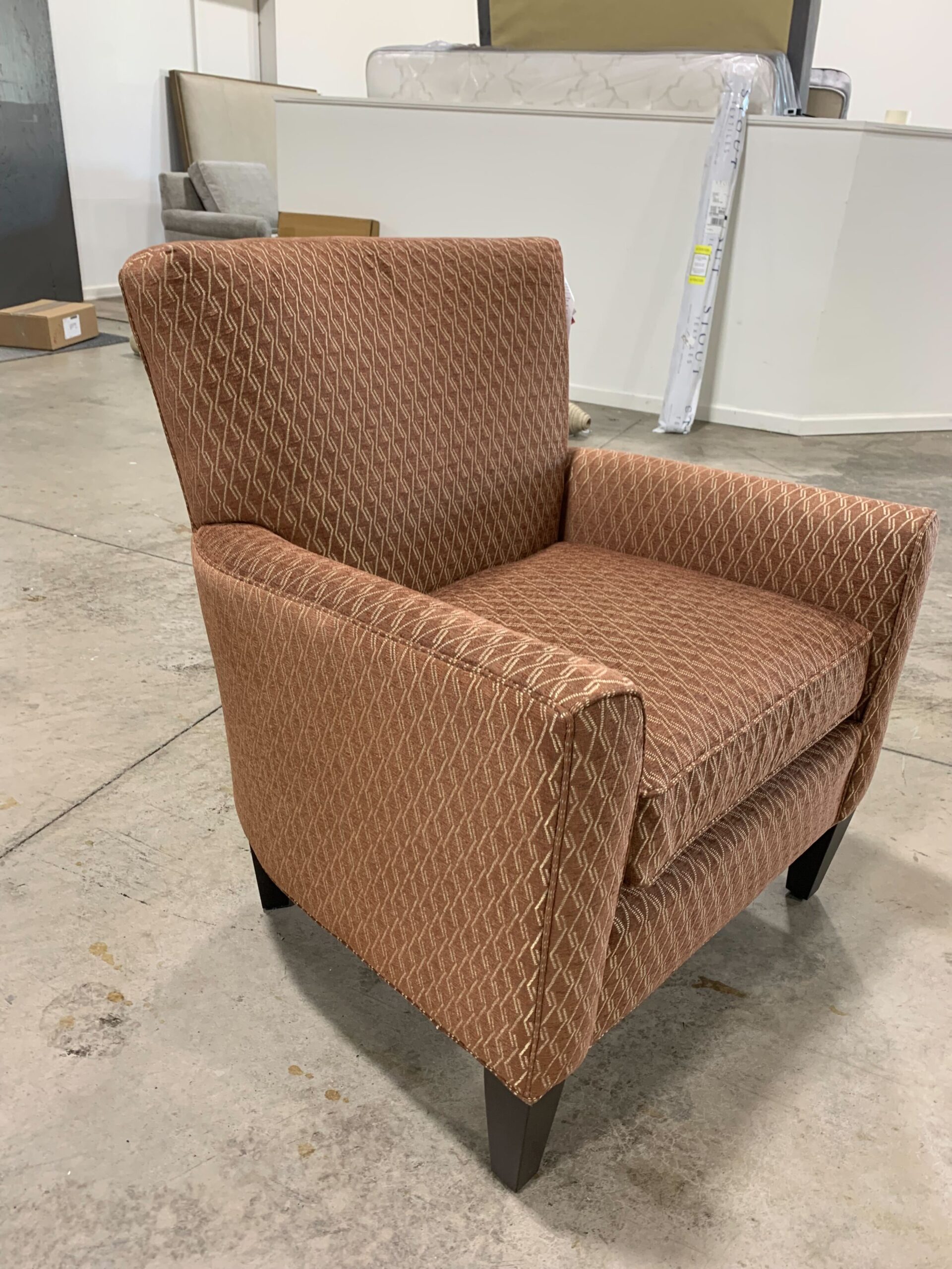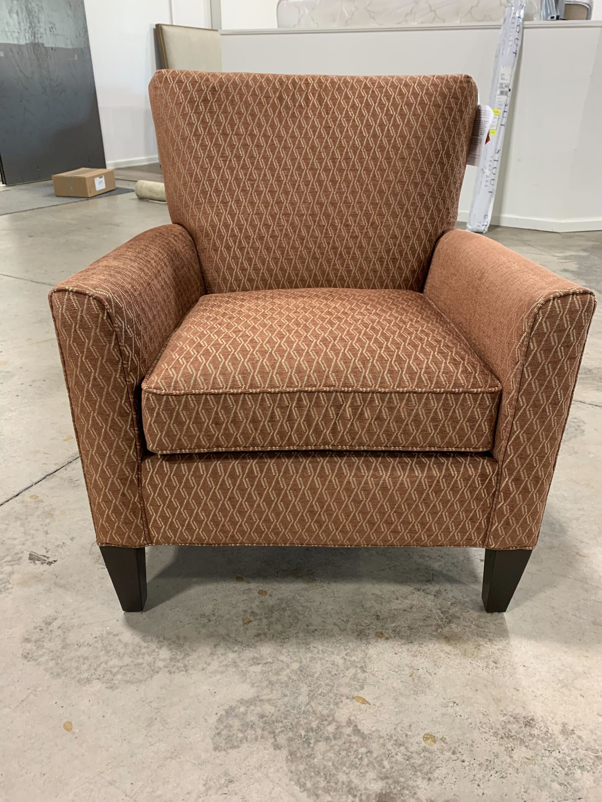 - The Collin chair features a square tight back, deep loose-welted seat cushions, and track arms